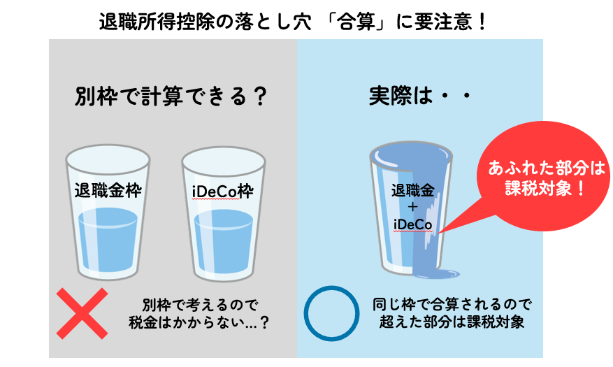 最大の落とし穴は、勤め先からもらう退職金と同じタイミング(同じ年)で手にすると「合算」されて計算されることです。この点は相談に来られる方の約7割が知らないという印象があります。